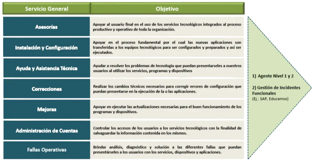 Se busca ser un punto único de contacto en donde se apoya a los usuarios o se escala a quien los pueda apoyar con los problemas o inconvenientes que enfrenten con los servicios de TI.